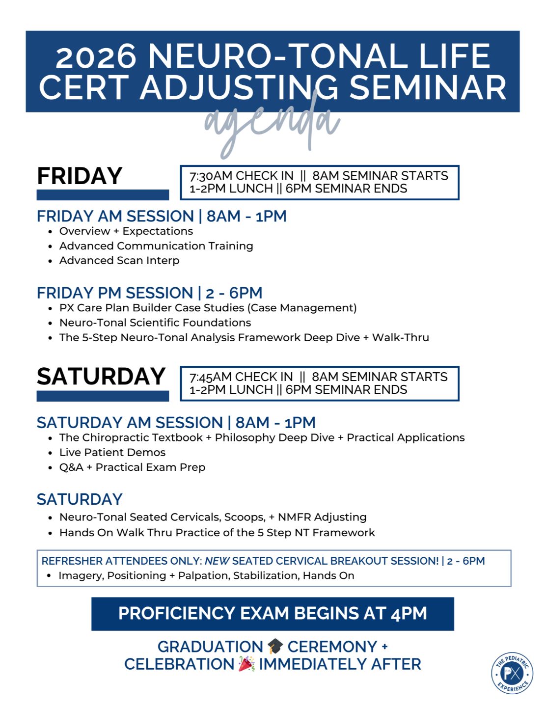 to download the agenda and timeline for your PX + Life U Neuro-Tonal Pediatric Adjusting Seminar in Marietta, GA!