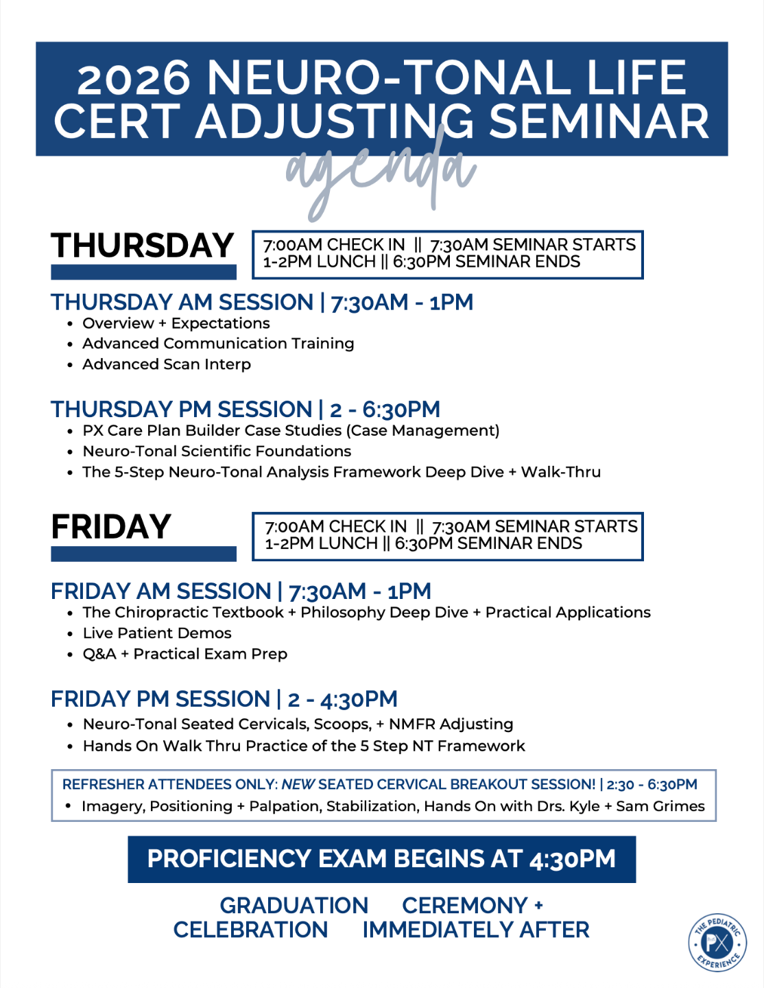 to download the agenda and timeline for your PX + Life U Neuro-Tonal Pediatric Adjusting Seminar in Crystal Lake!