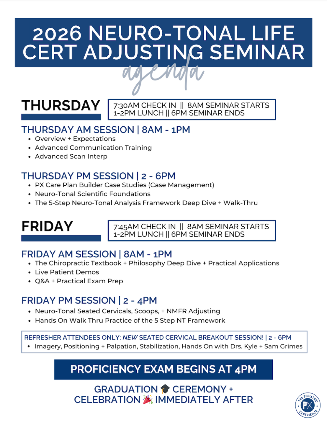 to download the agenda and timeline for your PX + Life U Neuro-Tonal Pediatric Adjusting Seminar in Crystal Lake!